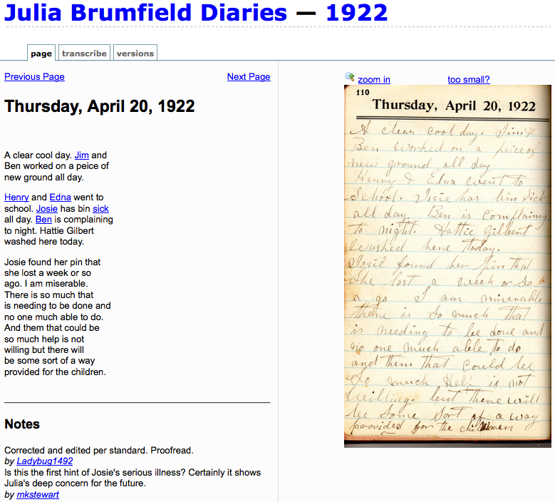 But, as typically happens, the patron took notes offline, transcribed and collated the text offline, dated the text on the basis of palaeographic comparanda offline, and published his findings offline. The scholarly workflow that generated the data, produced the findings, and communicated both to the wider community does not touch the library until it receives the journal in which the findings are published; even then, the enhanced information may not effect local intellectual control of the object. This is a missed opportunity, and also the historical pattern: patrons have entered special collections libraries, transcribed, translated, contextualized, and annotated materials, and then walked away knowing in some cases more about the materials than the libraries themselves do. But thanks to a wide variety of crowd-sourcing tools and practices, Libraries are now in a position to support more of that scholarly workflow, bringing more of the results back into the curatorial fold and sharing them with a wider audience than most specialized scholarly publications tend to target.